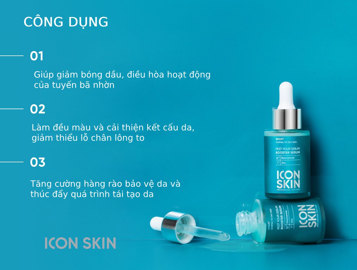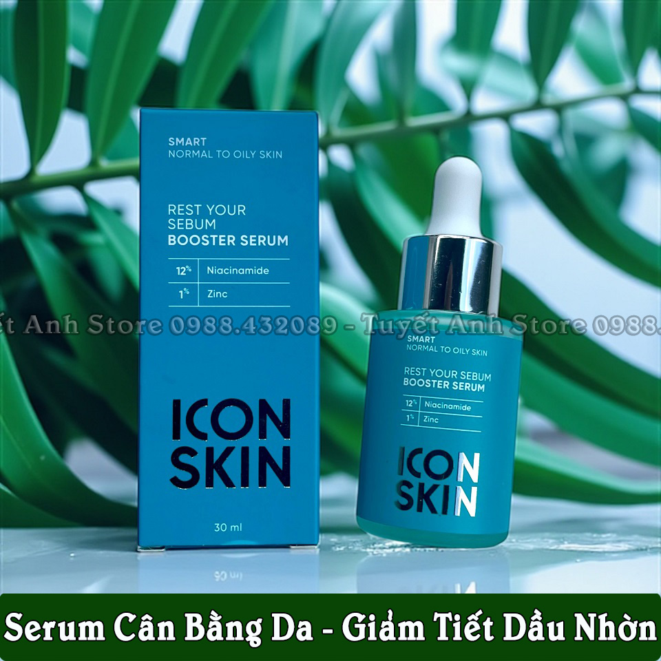 Giải pháp tối ưu cho làn da dầu – hỗn hợp dầu Bạn có đang lo lắng vì: Da luôn bóng dầu, kém mịn màng Lỗ chân lông to, dễ bí tắc gây mụn Da thiếu cân bằng, dễ nhạy cảm Đừng lo! ICON SKIN mang đến REST YOUR SEBUM BOOSTER SERUM – tinh chất “cân bằng dầu thừa” với công thức khoa học, an toàn và hiệu quả: 12% Niacinamide – kiểm soát bã nhờn, thu nhỏ lỗ chân lông, cải thiện sắc tố da. 1% Zinc (Kẽm) – kháng viêm, hỗ trợ ngừa mụn. Probiotic – tăng cường hàng rào bảo vệ tự nhiên cho da. Axit Hyaluronic – cấp ẩm sâu, giữ da mềm mịn mà không gây nhờn rít. Chiết xuất cam thảo – làm dịu, giảm kích ứng, hỗ trợ làm sáng da. Kết quả sau khi sử dụng: Da bớt bóng nhờn rõ rệt Lỗ chân lông se khít Làn da thông thoáng, căng mịn, sáng khỏe Phù hợp cho da dầu – hỗn hợp thiên dầu, kể cả làn da dễ bị mụn.