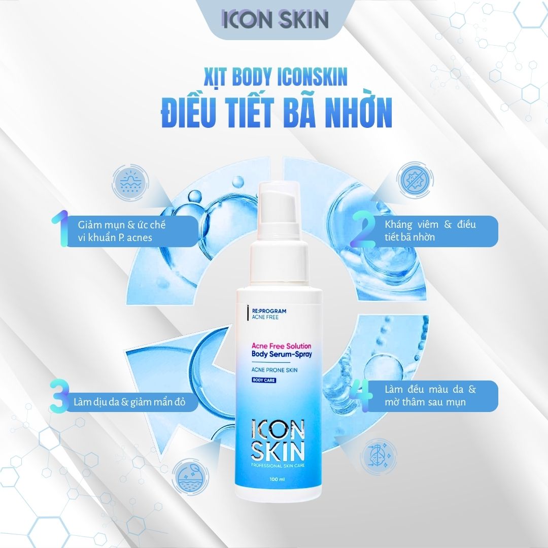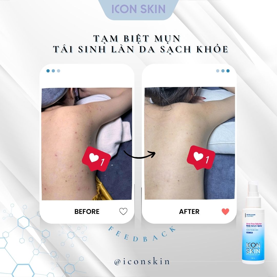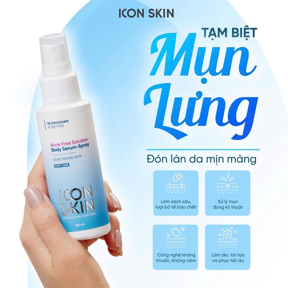 Mụn lưng, mụn ngực khiến nhiều người mất tự tin khi mặc áo hở lưng, váy hai dây. Icon Skin Body Serum Spray được thiết kế chuyên biệt cho làn da dễ nổi mụn ở cơ thể, giúp làm sạch – giảm mụn – phục hồi da hiệu quả.
